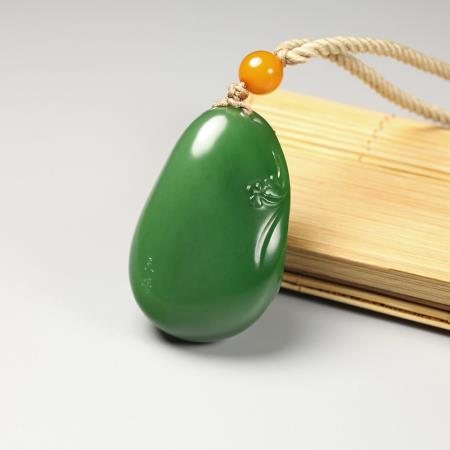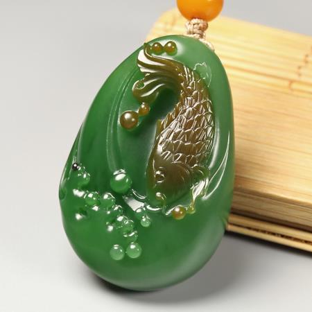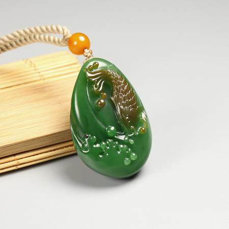 碧玉巧雕挂件-碧波金鲤 价格:19000元,规格:高4.2宽2.9厚1.7cm,重量:31.4克 作品玉质通透沉凝,细腻温润。碧波翻涌,一鱼奋力溯游,摆尾处,水花溅起,滴滴如珠。整件作品线条分明清晰,张力十足。
